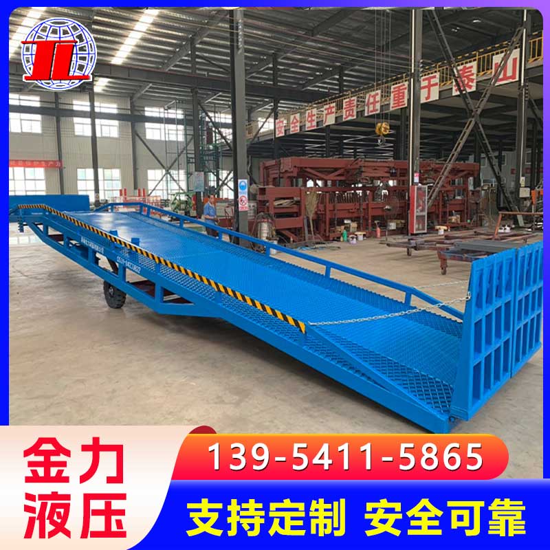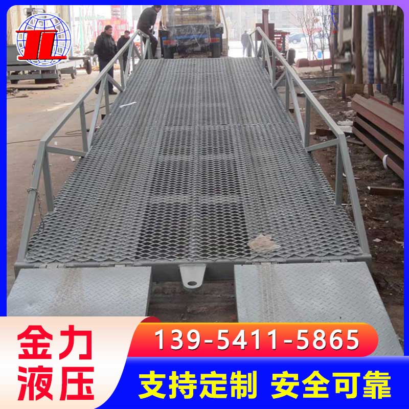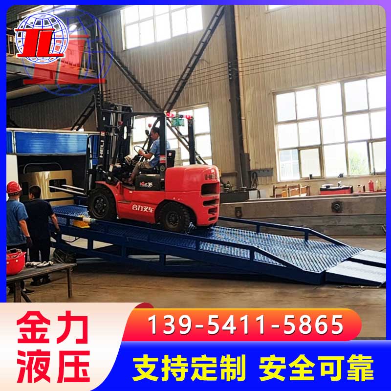 移动登车桥是与叉车配合使用的货物装卸辅助设备,可根据货车车厢不同高度调节,实现货物的快速装卸。